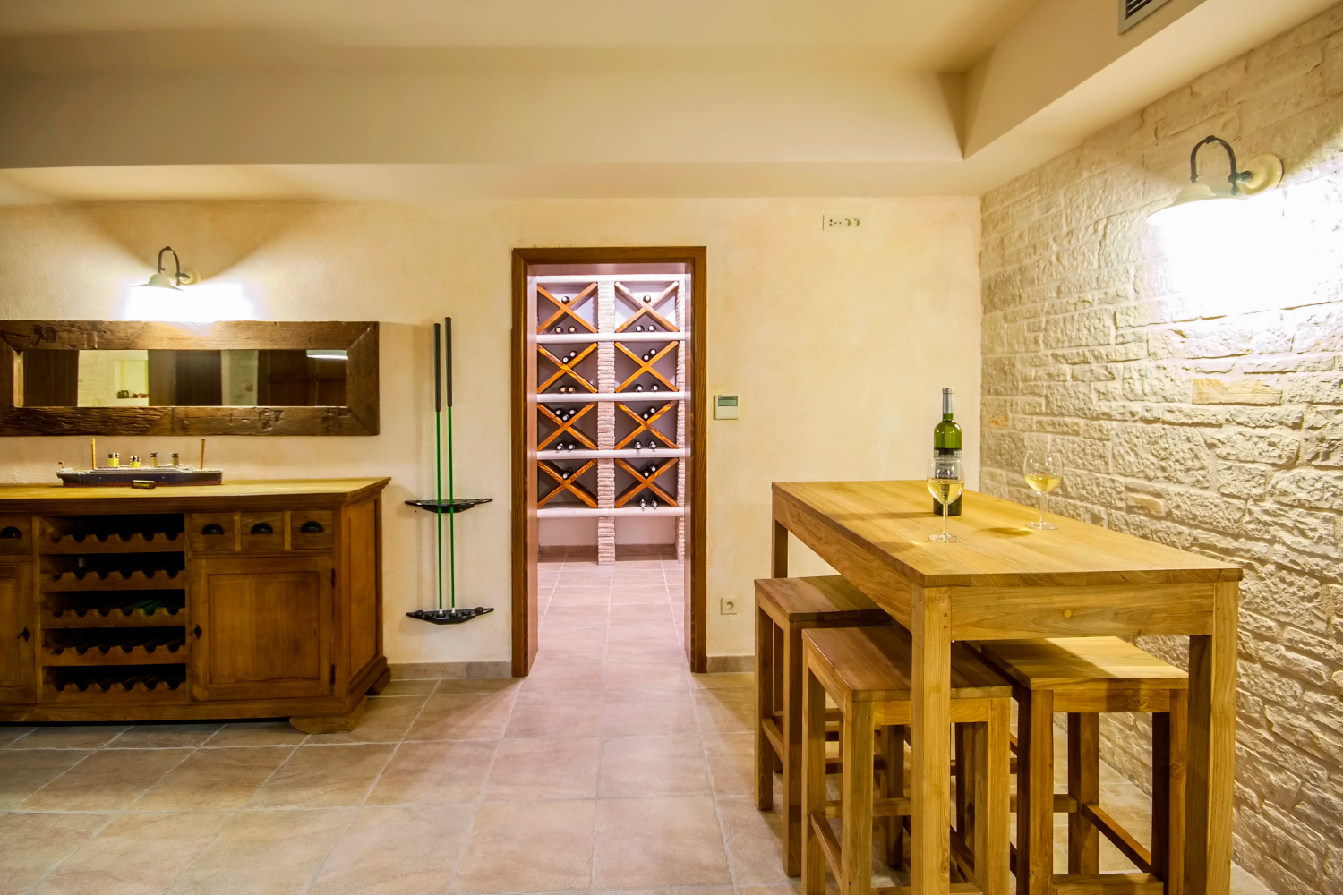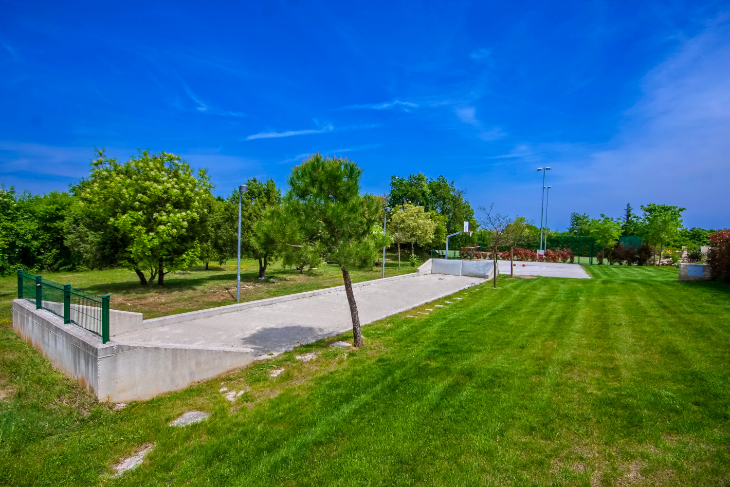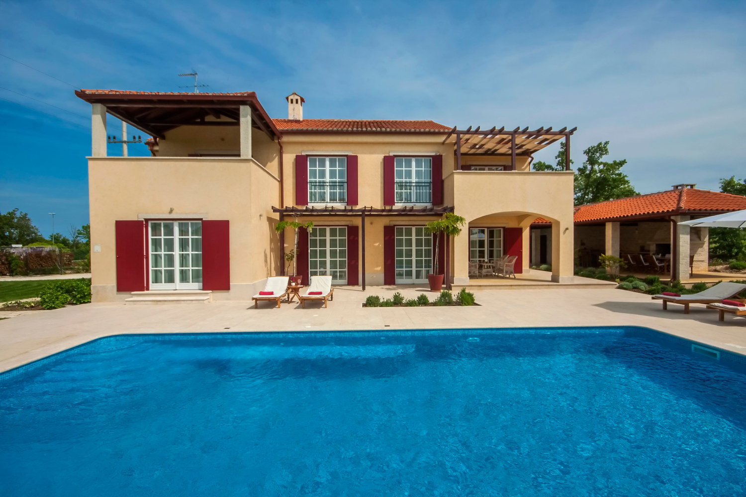 Schöne Villa Mirna befindet sich im äußersten Süden Istriens in der Stadt Svetvinčenat, die mit ihrem reichen touristischen und gastronomischen Angebot sowie zahlreichen kulturellen und historischen Sehenswürdigkeiten begeistert. Umgeben von Wiesen und duftender mediterraner Vegetation ist die Villa Mirna die perfekte Wahl für alle, die einen wirklich erholsamen Urlaub suchen.Mit einer Wohnfläche von 318 m² besteht die Villa Mirna aus 4 Schlafzimmern, von denen sich zwei im ersten Stock befinden und jeweils über eine eigene Terrasse mit einem Tisch und zwei Stühlen verfügen. Das dritte Schlafzimmer im ersten Stock hat französische Fenster, während sich das letzte Zimmer im Erdgeschoss der Villa befindet. Dieses hat einen direkten Zugang zum Pool. Drei Schlafzimmer sind mit Doppelbetten ausgestattet, eines verfügt über zwei Einzelbetten, die bei Bedarf zusammengestellt werden können, sowie über eine Galerie mit einem Doppelbett. Jedes Schlafzimmer hat ein eigenes Badezimmer mit Fußbodenheizung und Heizkörper. Außerdem gibt es ein zusätzliches Badezimmer im Nebengebäude in der Nähe der Sauna und des Pools.Den Gästen der Villa Mirna stehen außerdem eine separate Toilette, eine voll ausgestattete Küche mit Essbereich sowie ein Wohnzimmer mit Fernseher, PlayStation-Konsole und Kamin zur Verfügung.Die Villa Mirna befindet sich auf einem 25.000 m² großen Grundstück zusammen mit 3 weiteren Villen. Alle Villen teilen sich 2 Tennisplätze, ein halbes Basketballfeld (1 Korb), 2 Spielplätze und eine Boccia-Bahn. Den Gästen der Villa Mirna ist durch Hecken und Bäume, die jede Villa umgeben, absolute Privatsphäre garantiert. Der 3.000 m² große Hof verfügt über einen Swimmingpool (50 m²) mit Heiz- und Massagefunktion, umgeben von Sonnenliegen.