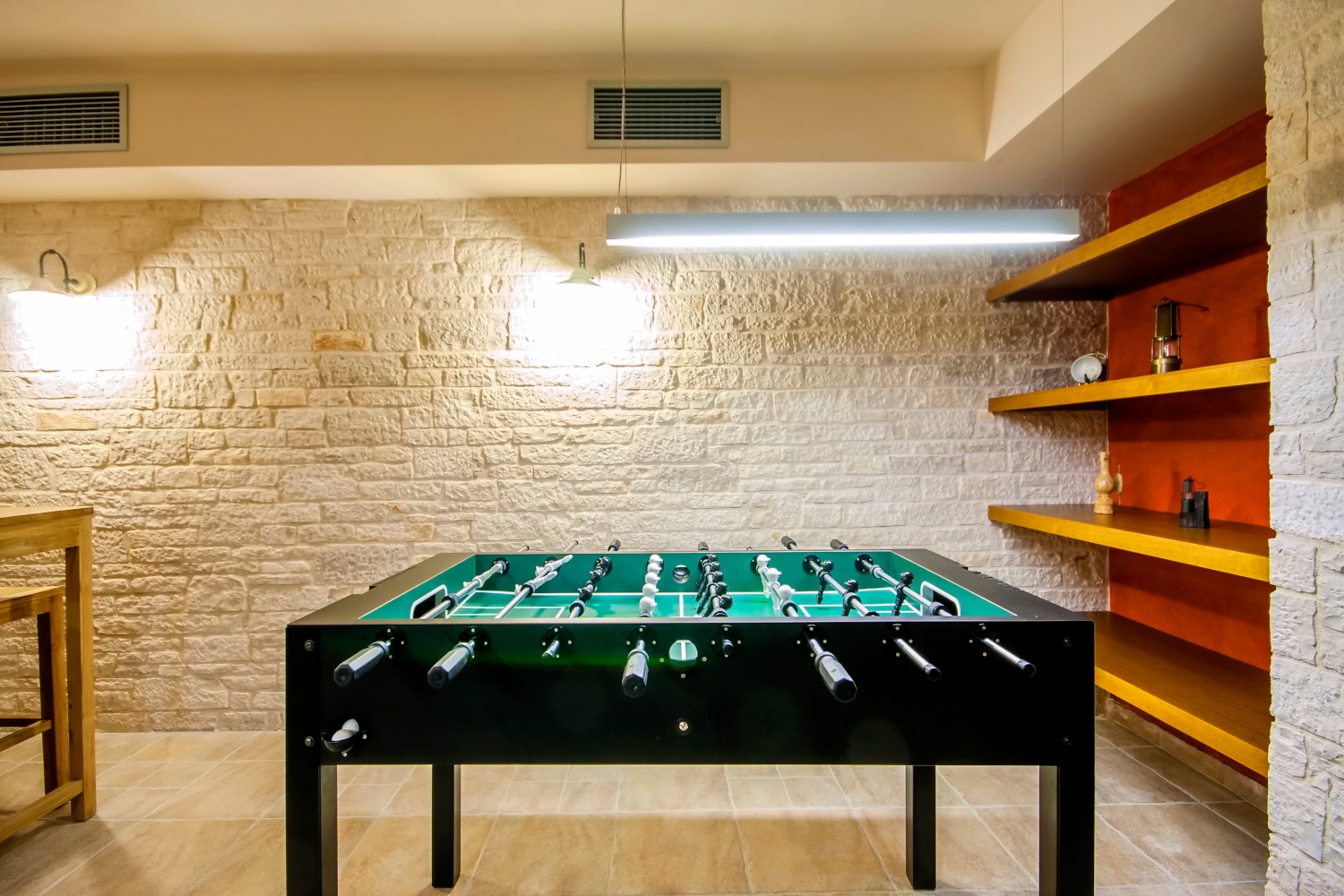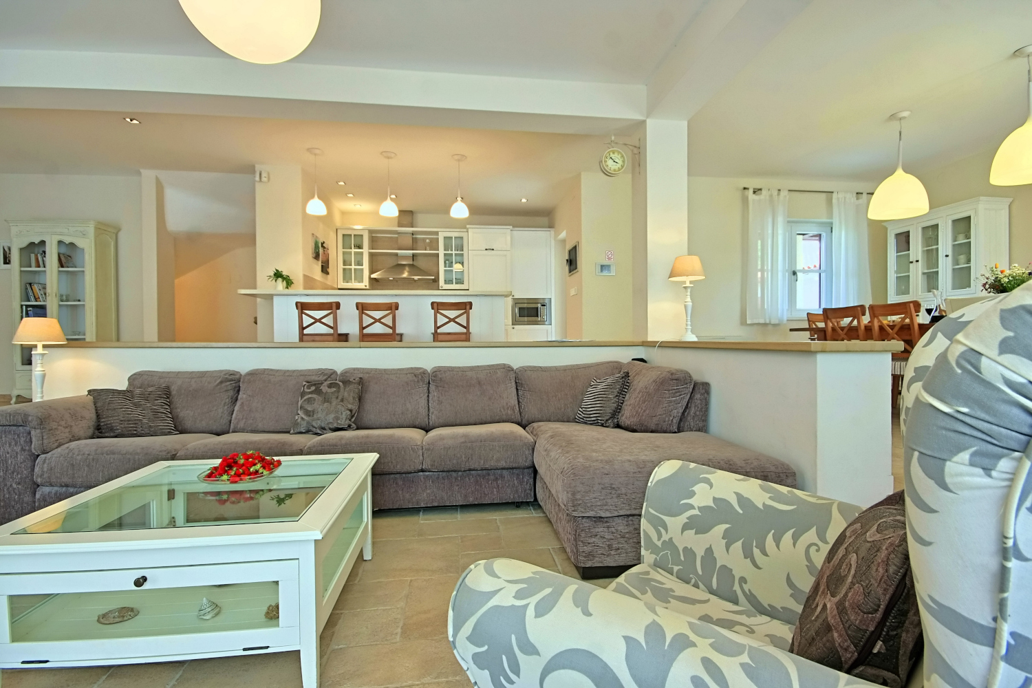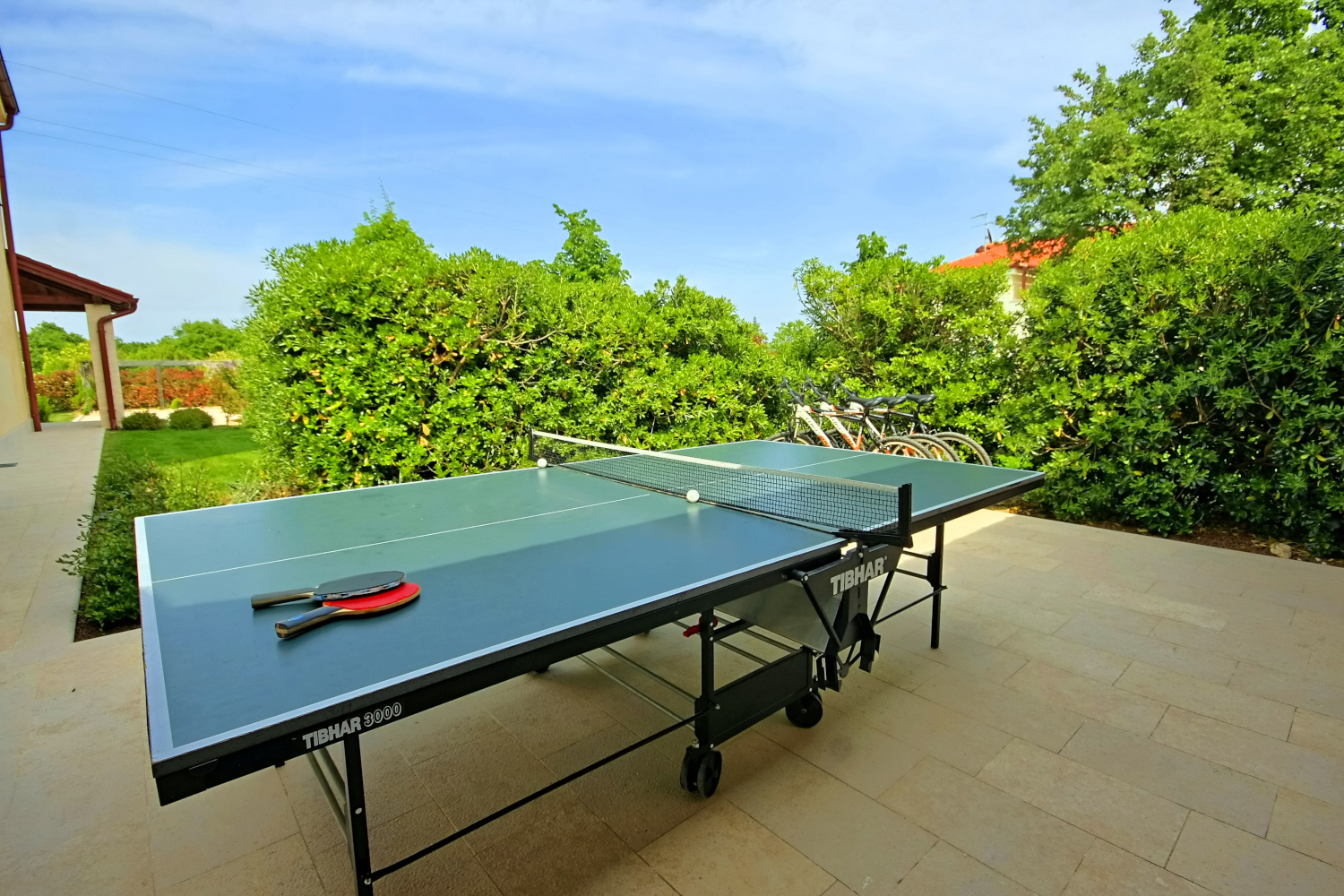 Schöne Villa Mirna befindet sich im äußersten Süden Istriens in der Stadt Svetvinčenat, die mit ihrem reichen touristischen und gastronomischen Angebot sowie zahlreichen kulturellen und historischen Sehenswürdigkeiten begeistert. Umgeben von Wiesen und duftender mediterraner Vegetation ist die Villa Mirna die perfekte Wahl für alle, die einen wirklich erholsamen Urlaub suchen.Mit einer Wohnfläche von 318 m² besteht die Villa Mirna aus 4 Schlafzimmern, von denen sich zwei im ersten Stock befinden und jeweils über eine eigene Terrasse mit einem Tisch und zwei Stühlen verfügen. Das dritte Schlafzimmer im ersten Stock hat französische Fenster, während sich das letzte Zimmer im Erdgeschoss der Villa befindet. Dieses hat einen direkten Zugang zum Pool. Drei Schlafzimmer sind mit Doppelbetten ausgestattet, eines verfügt über zwei Einzelbetten, die bei Bedarf zusammengestellt werden können, sowie über eine Galerie mit einem Doppelbett. Jedes Schlafzimmer hat ein eigenes Badezimmer mit Fußbodenheizung und Heizkörper. Außerdem gibt es ein zusätzliches Badezimmer im Nebengebäude in der Nähe der Sauna und des Pools.Den Gästen der Villa Mirna stehen außerdem eine separate Toilette, eine voll ausgestattete Küche mit Essbereich sowie ein Wohnzimmer mit Fernseher, PlayStation-Konsole und Kamin zur Verfügung.Die Villa Mirna befindet sich auf einem 25.000 m² großen Grundstück zusammen mit 3 weiteren Villen. Alle Villen teilen sich 2 Tennisplätze, ein halbes Basketballfeld (1 Korb), 2 Spielplätze und eine Boccia-Bahn. Den Gästen der Villa Mirna ist durch Hecken und Bäume, die jede Villa umgeben, absolute Privatsphäre garantiert. Der 3.000 m² große Hof verfügt über einen Swimmingpool (50 m²) mit Heiz- und Massagefunktion, umgeben von Sonnenliegen.